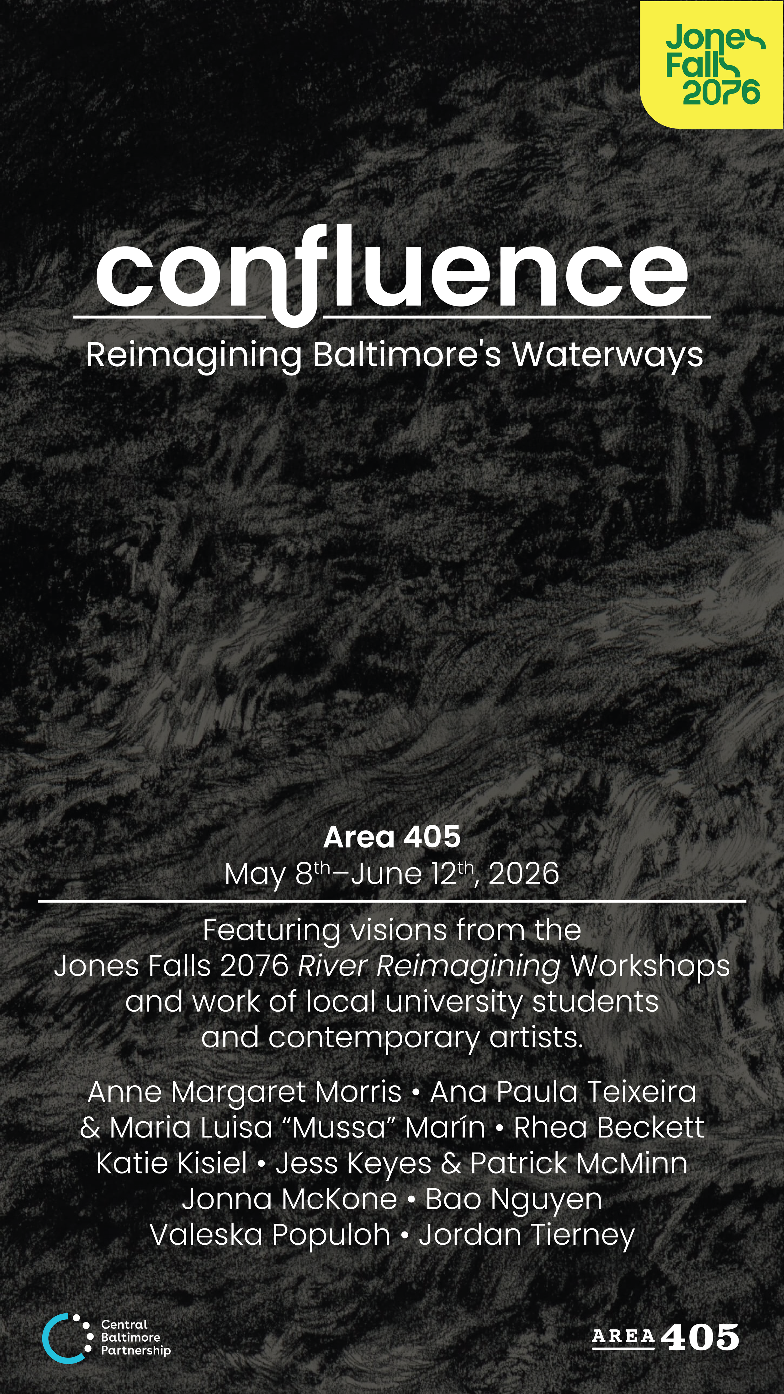 In collaboration with the the Jones Falls 2076 project, AREA 405 presents Confluence Reimagining Baltimore’s Waterways, featuring visions from the Jones Falls 2076 River Reimagining Workshops, work by local university students, and contemporary artists Ann Margaret Morris, Ana Paula Teixeira & María Luisa "Mussa" Marín, Bao Nguyen, Valeska Populoh, Rhea Beckett, Jess Keyes & Patrick McMinn, Katie Kisiel, Jonna McKone, and Jordan Tierney. The exhibition will open on Friday, May 8, and close on Friday, June 12, with both events participating in the Station North Second Friday Art Walk from 5:00 – 9:00 p.m.